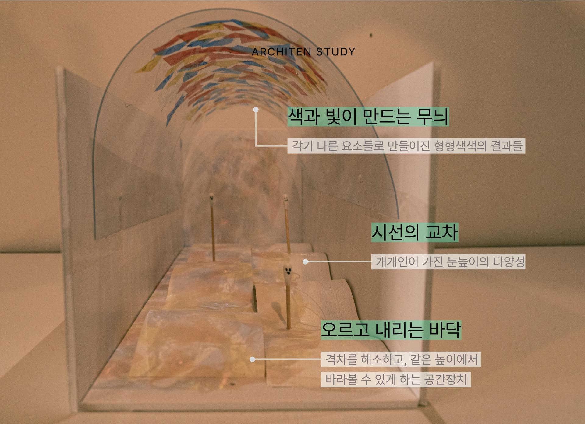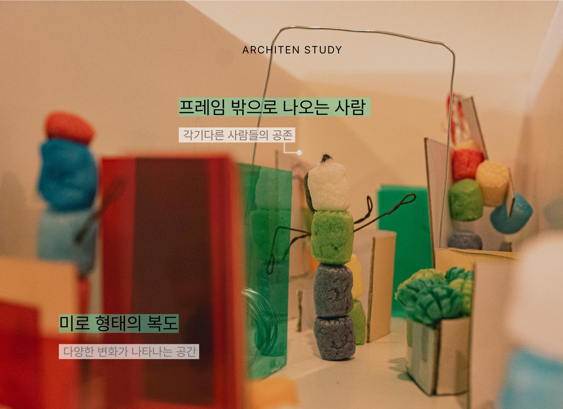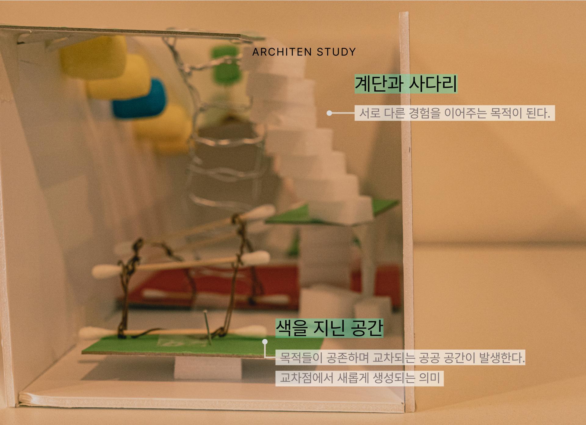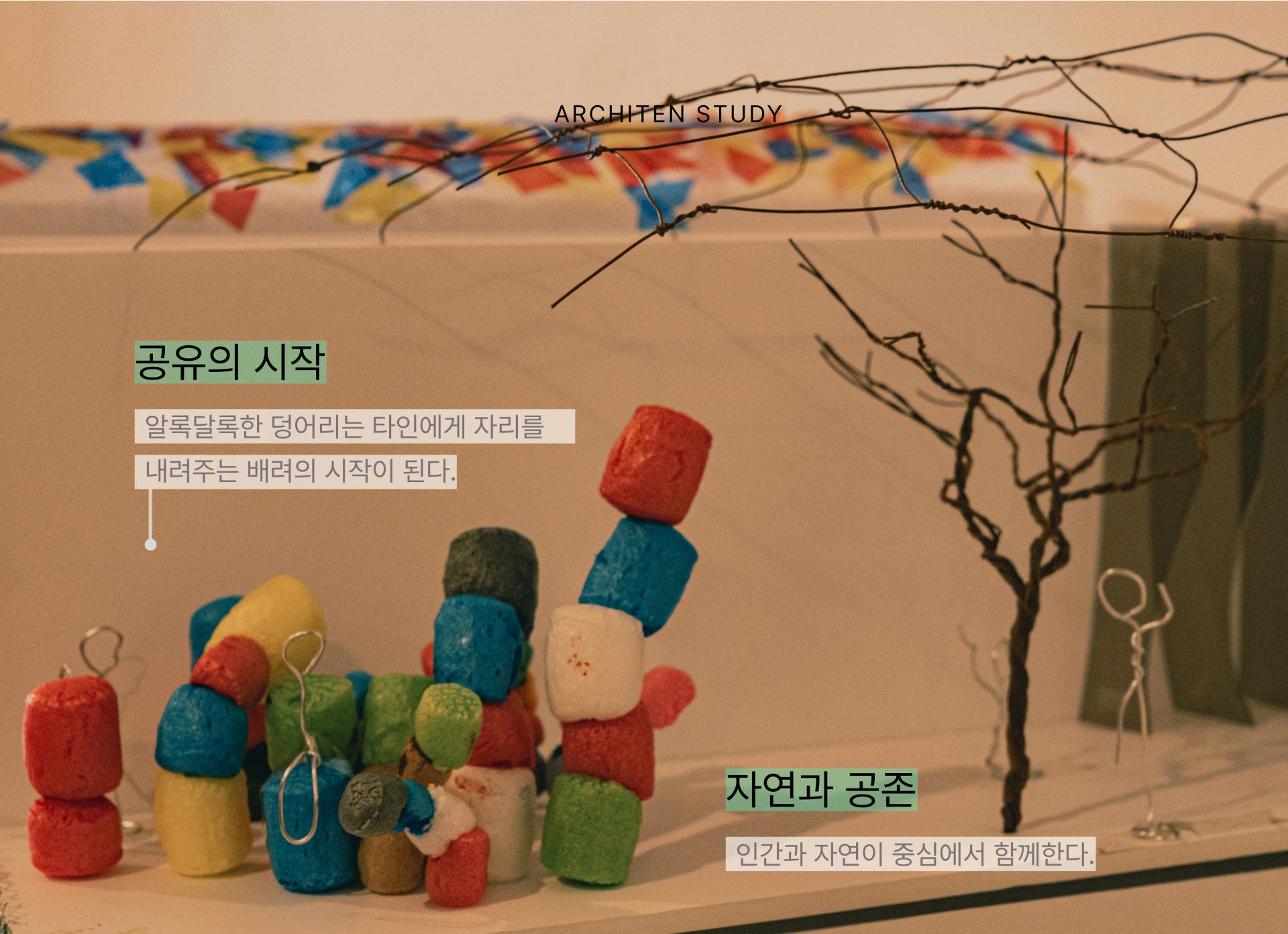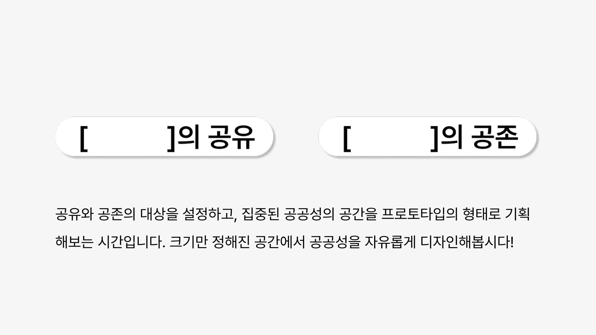 각 참여자들이 제시한 공간을 통해 서로의 시선을 공유하며, 건축이 사회적 관계망 속에서 어떤 역할을 할 수 있는지를 모색하고, 그 탐구의 결과를 바탕으로 실제 ‘공유’와 ‘공존’이 이루어지는 팝업 공간의 스케일을 축소한 프로토타입을 다양한 재료로 제작하는 실험을 진행한다.