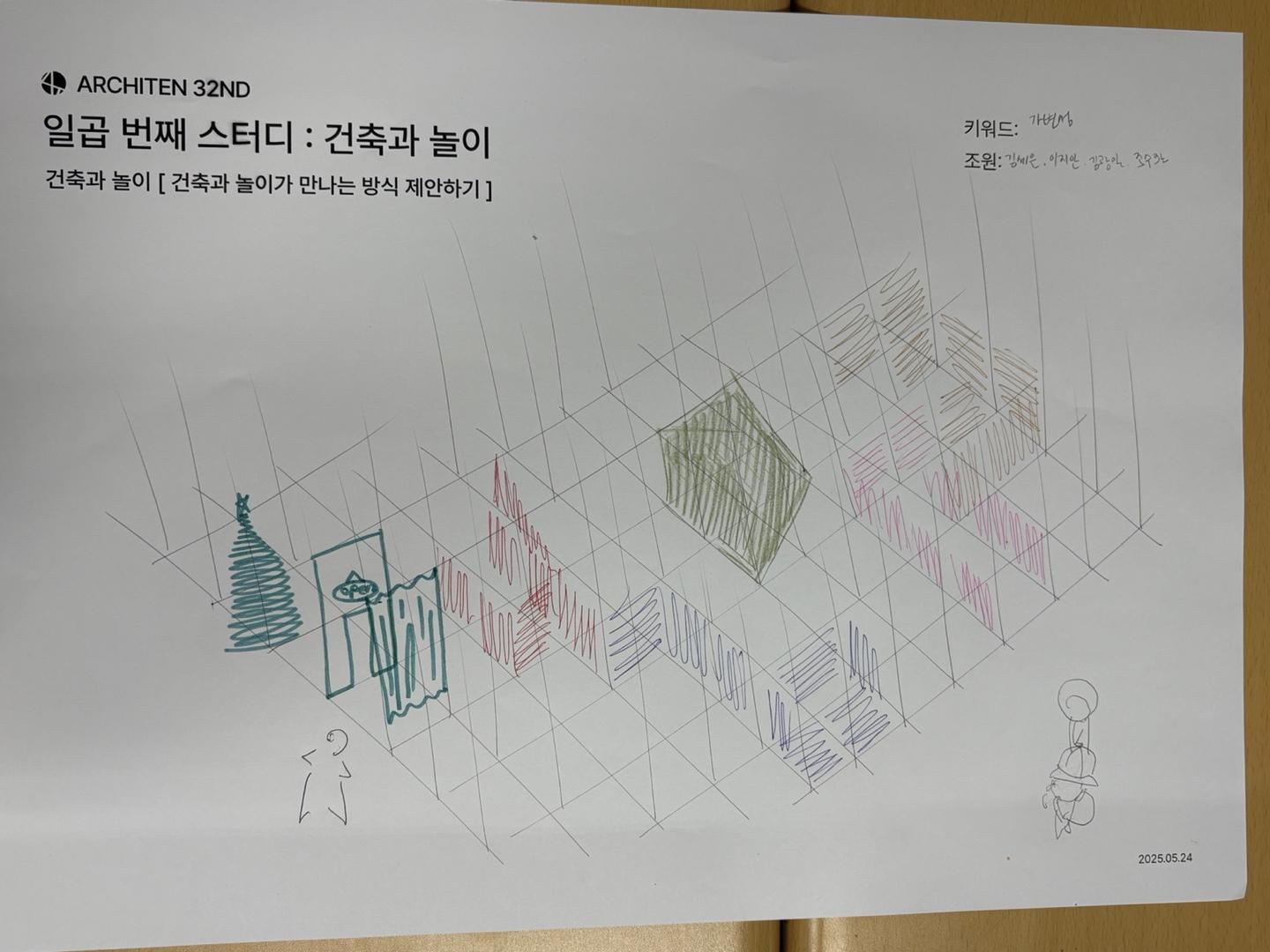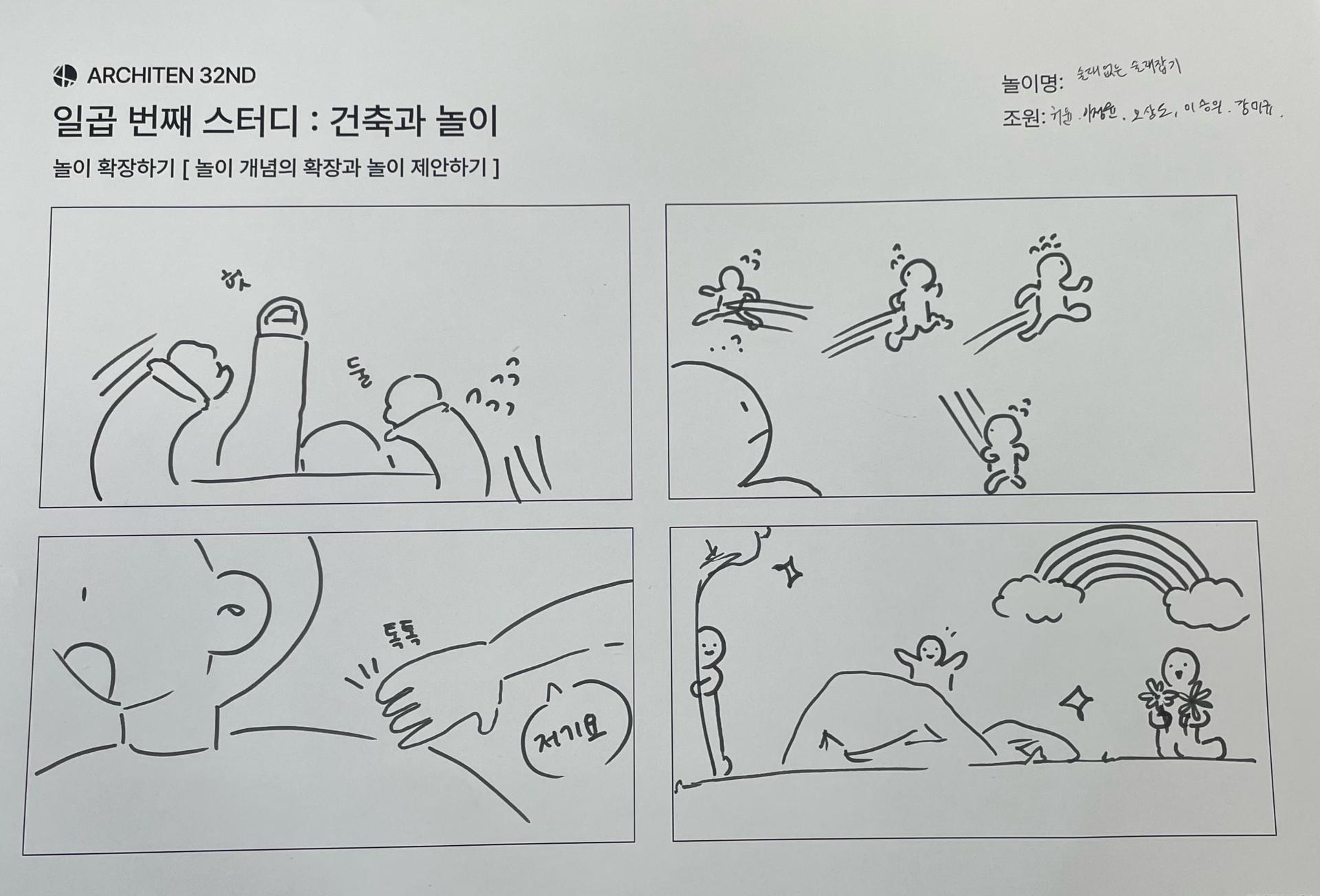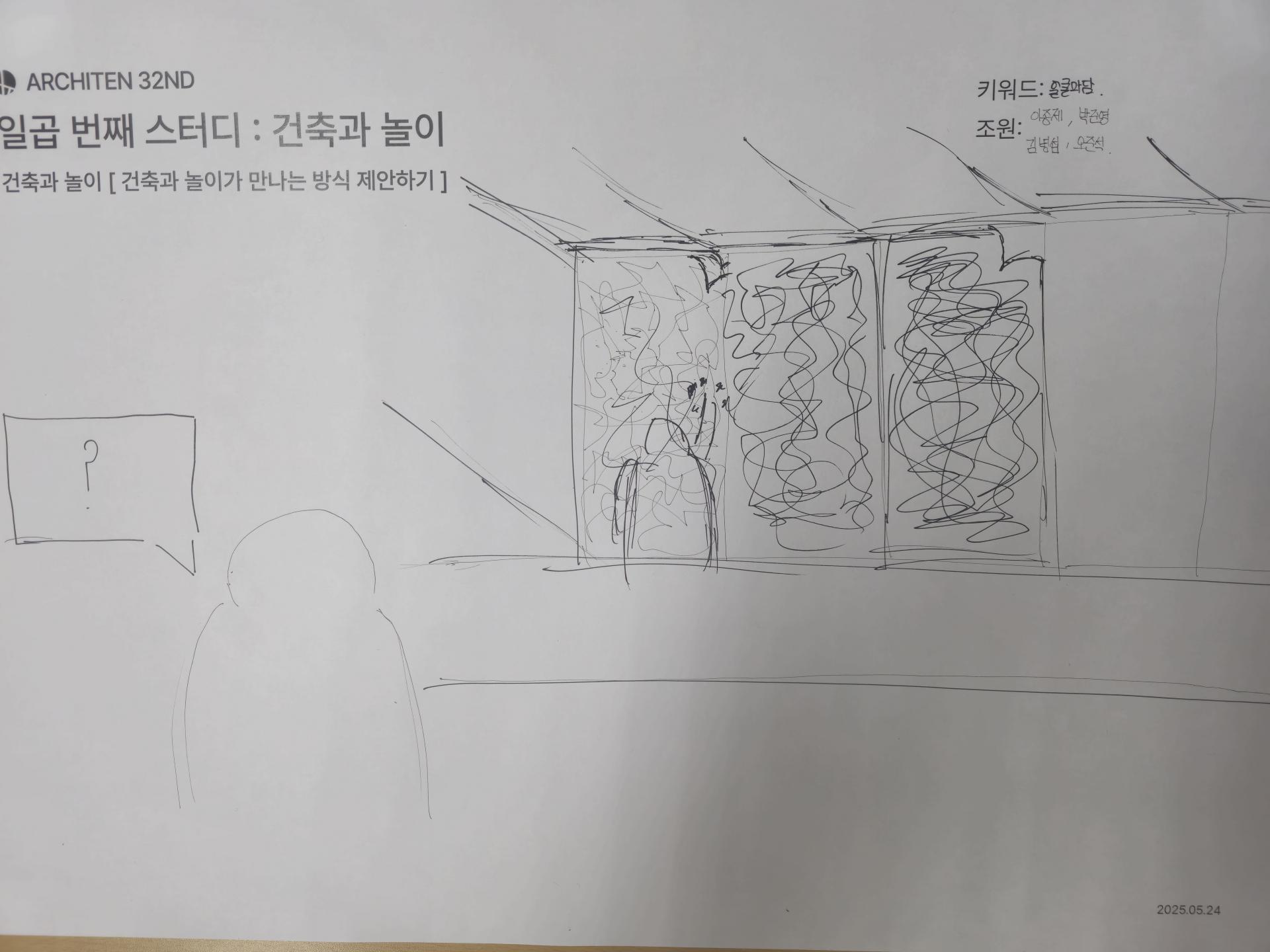 건축은 놀이가 될 수 있을까? 혹은 놀이는 어떻게 건축과 만날 수 있을까? 33기 일곱 번째 스터디에서는 메인 프로젝트인 ‘건축 놀이터’에 앞서, 건축과 놀이의 관계를 탐구하며 질문을 시작하는 시간을 가진다.