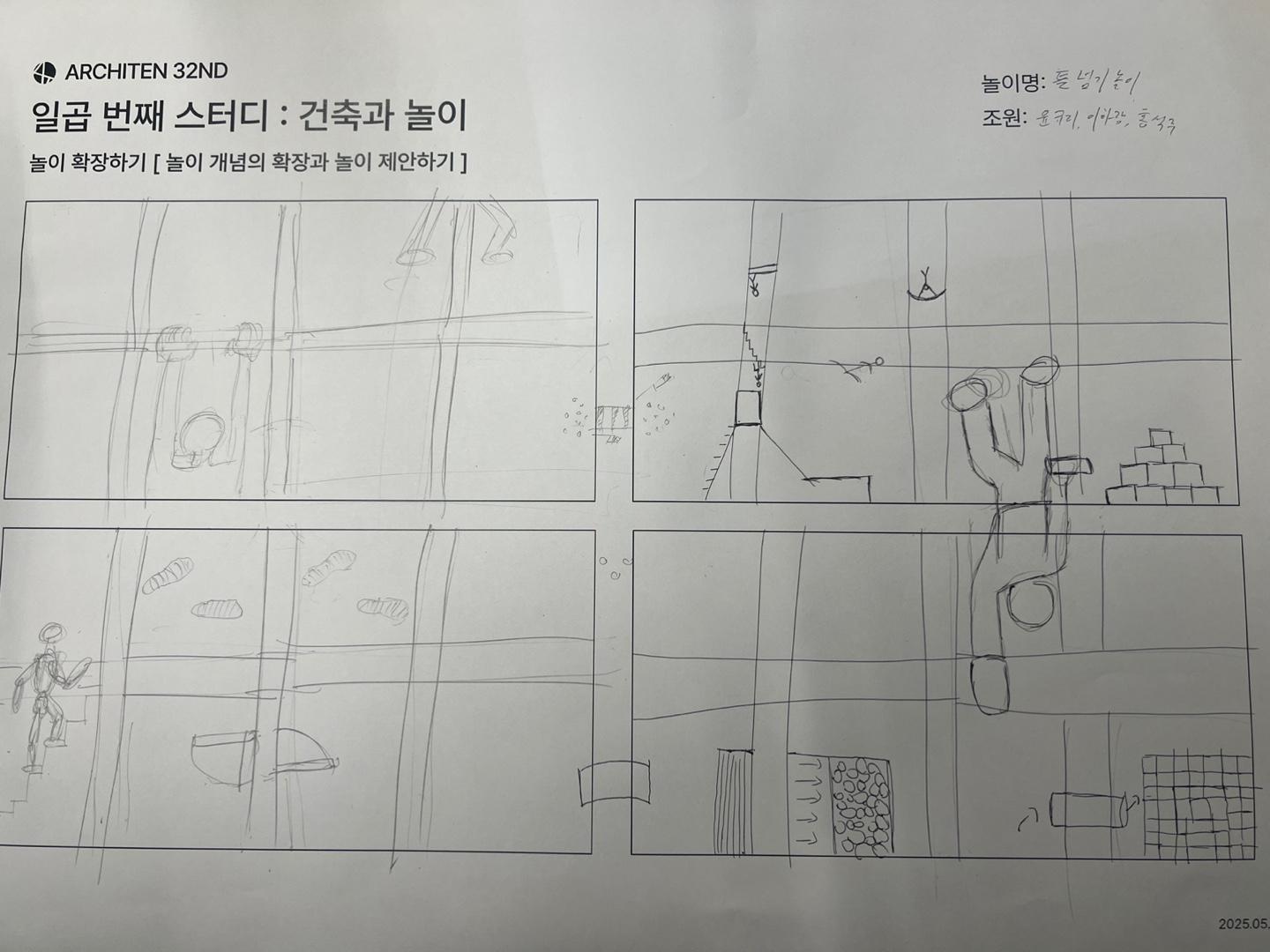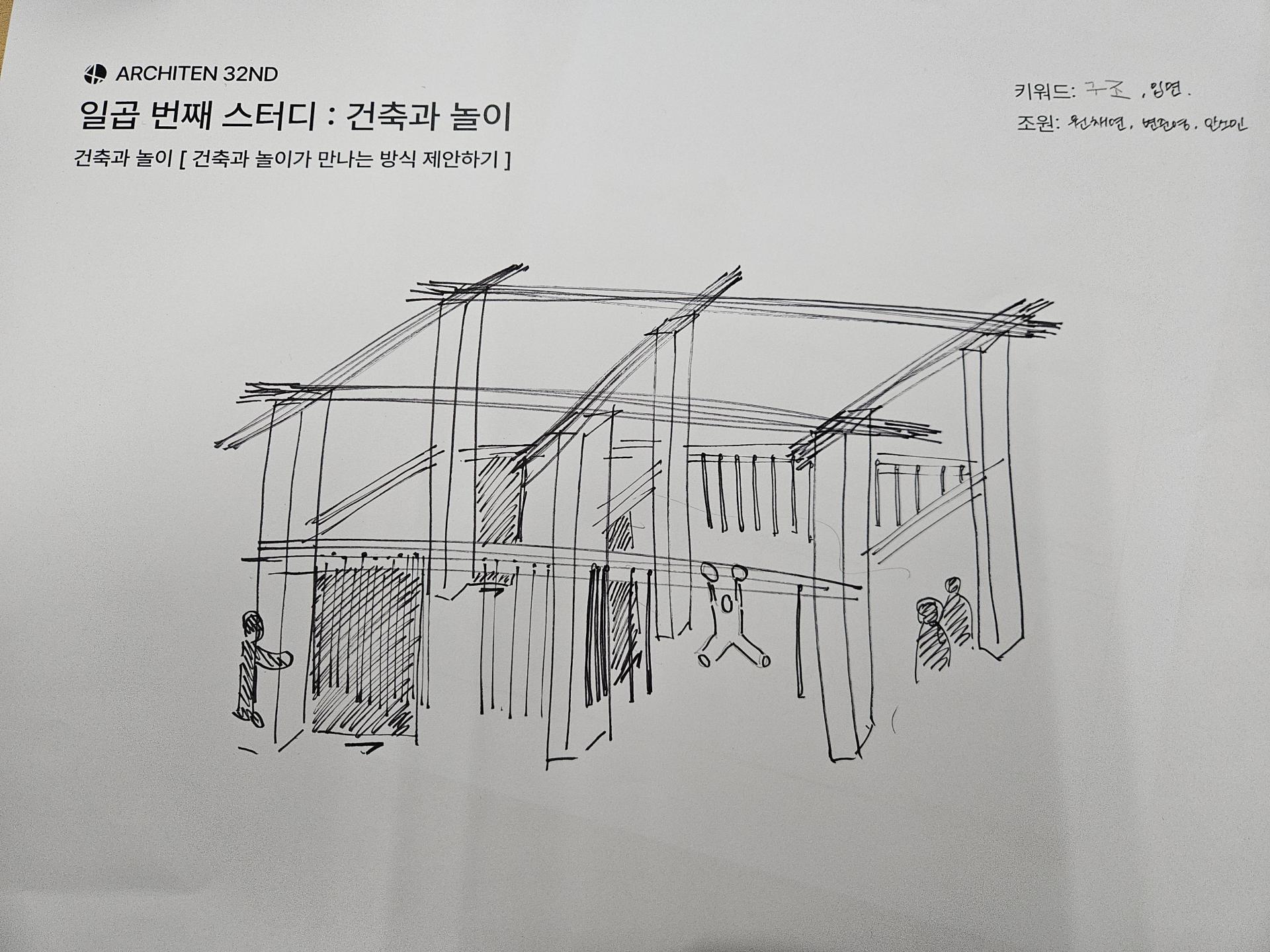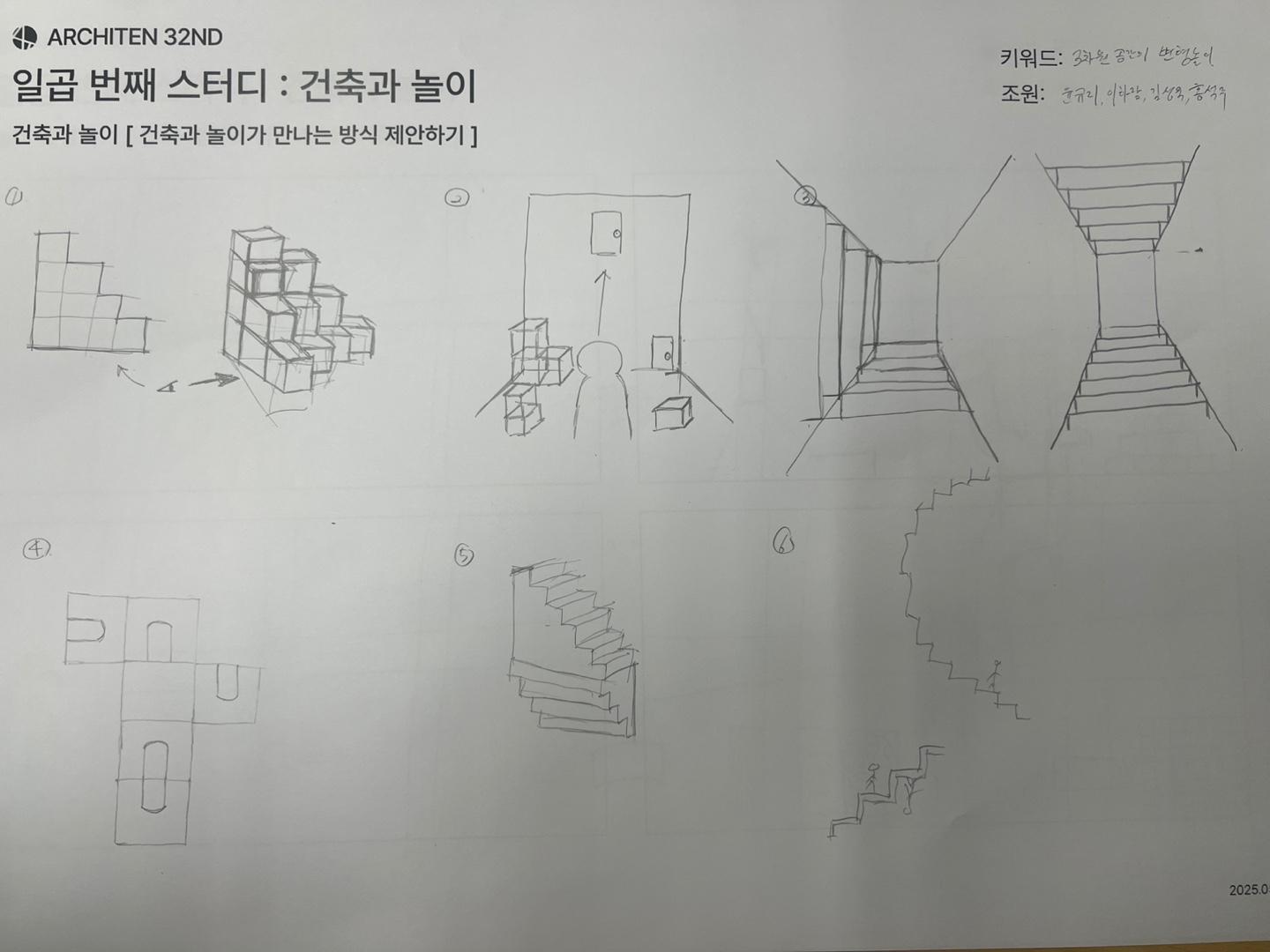 건축은 놀이가 될 수 있을까? 혹은 놀이는 어떻게 건축과 만날 수 있을까? 33기 일곱 번째 스터디에서는 메인 프로젝트인 ‘건축 놀이터’에 앞서, 건축과 놀이의 관계를 탐구하며 질문을 시작하는 시간을 가진다.
