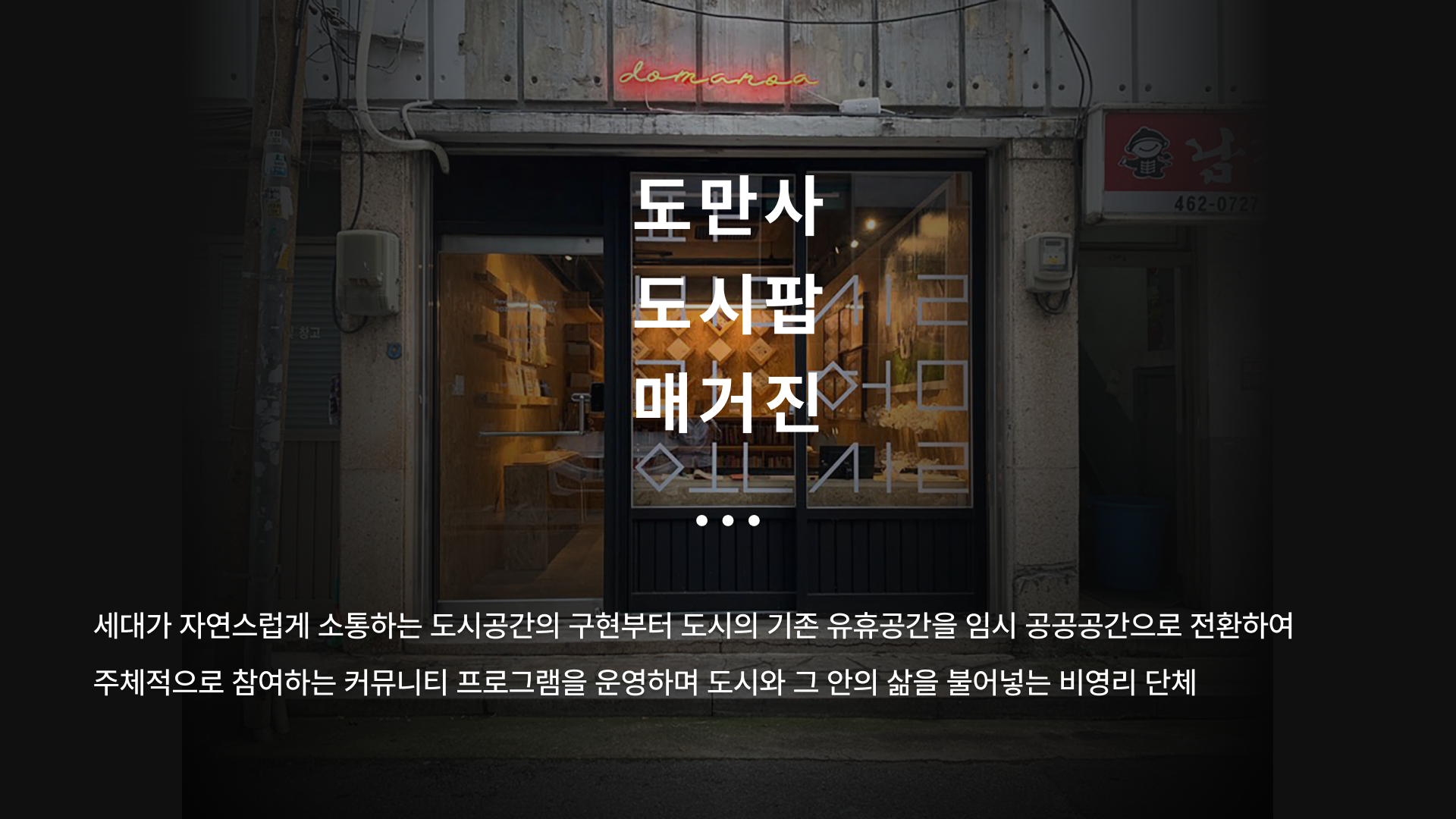 도만사는 "도시를 만드는 사람들" 이라는 뜻을 가지고 있으며, 성수동에 위치한 작은 도시문화 플랫폼입니다. 도시가 우리 삶에 터전이라는 것을 인지하고, 우리가 직면하고 있는 도시의 정치, 사회, 환경적 이슈들을 함께 논의하고 담론들을 통하여 아이디어를 공유하는 도시문화를 만들어가고자 합니다. 다양한 사람들과 함께 건축, 예술, 디자인을 통해 소통하며, 도시를 주제로 한 토크와 전시, 연구 및 출판 등 다양한 매체를 통해 도시를 배우고 이해하는 시작점이 되고자 합니다.