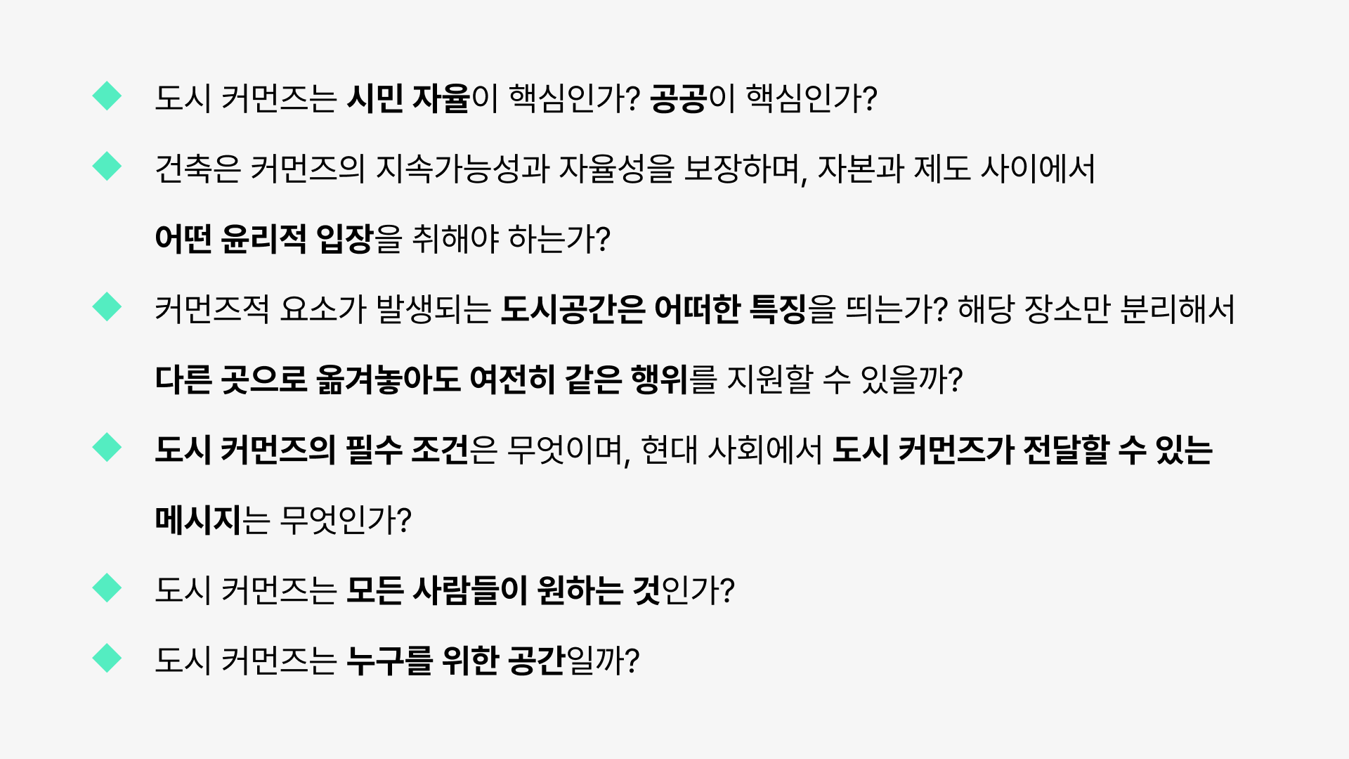 조사 과정에서 발생한 다양한 질문들을 바탕으로 참가자들은 서로의 시각을 나누고, 커먼즈가 지닌 사회적 의미와 건축적 가능성에 대해 의견을 나눈다.