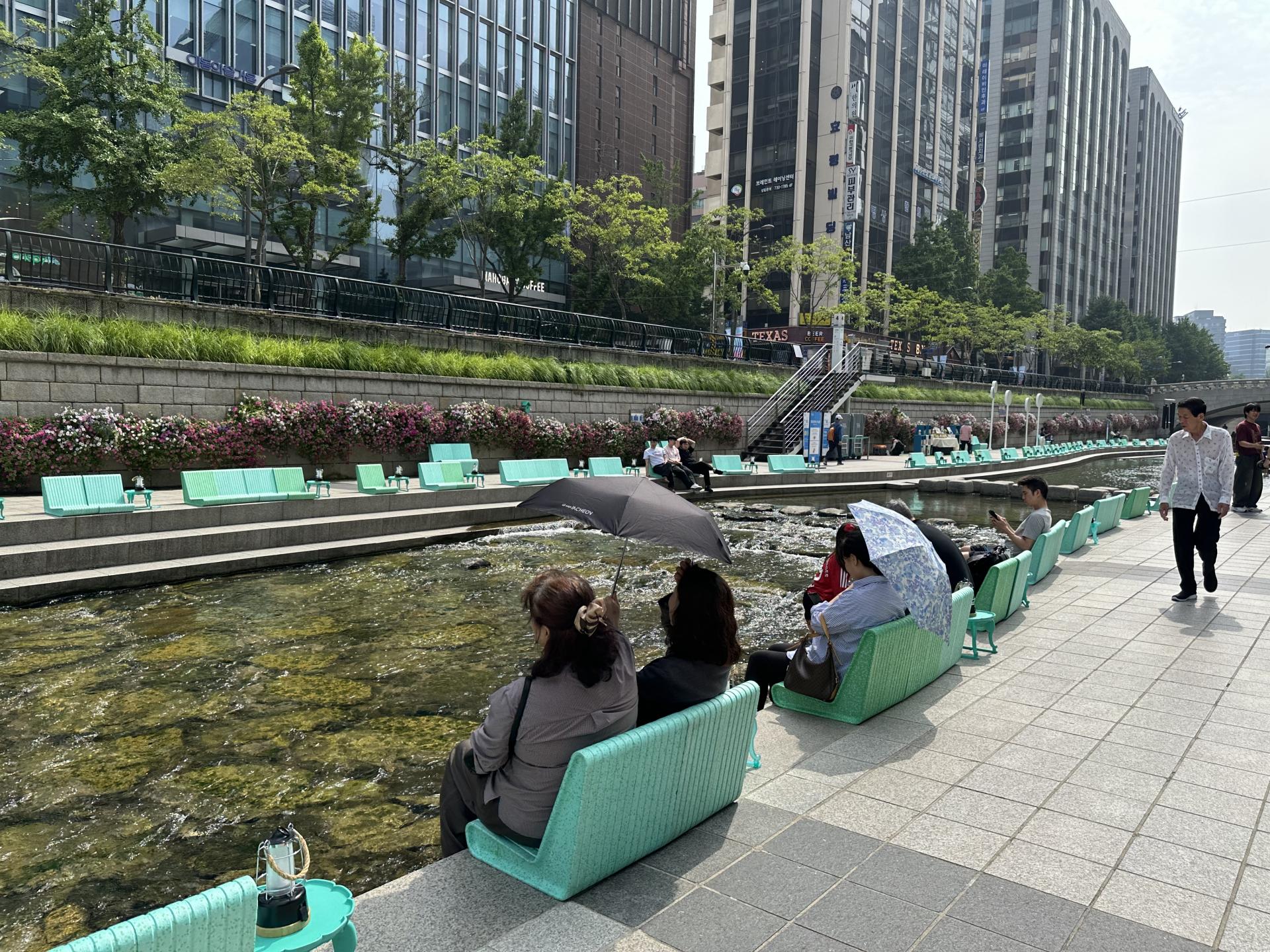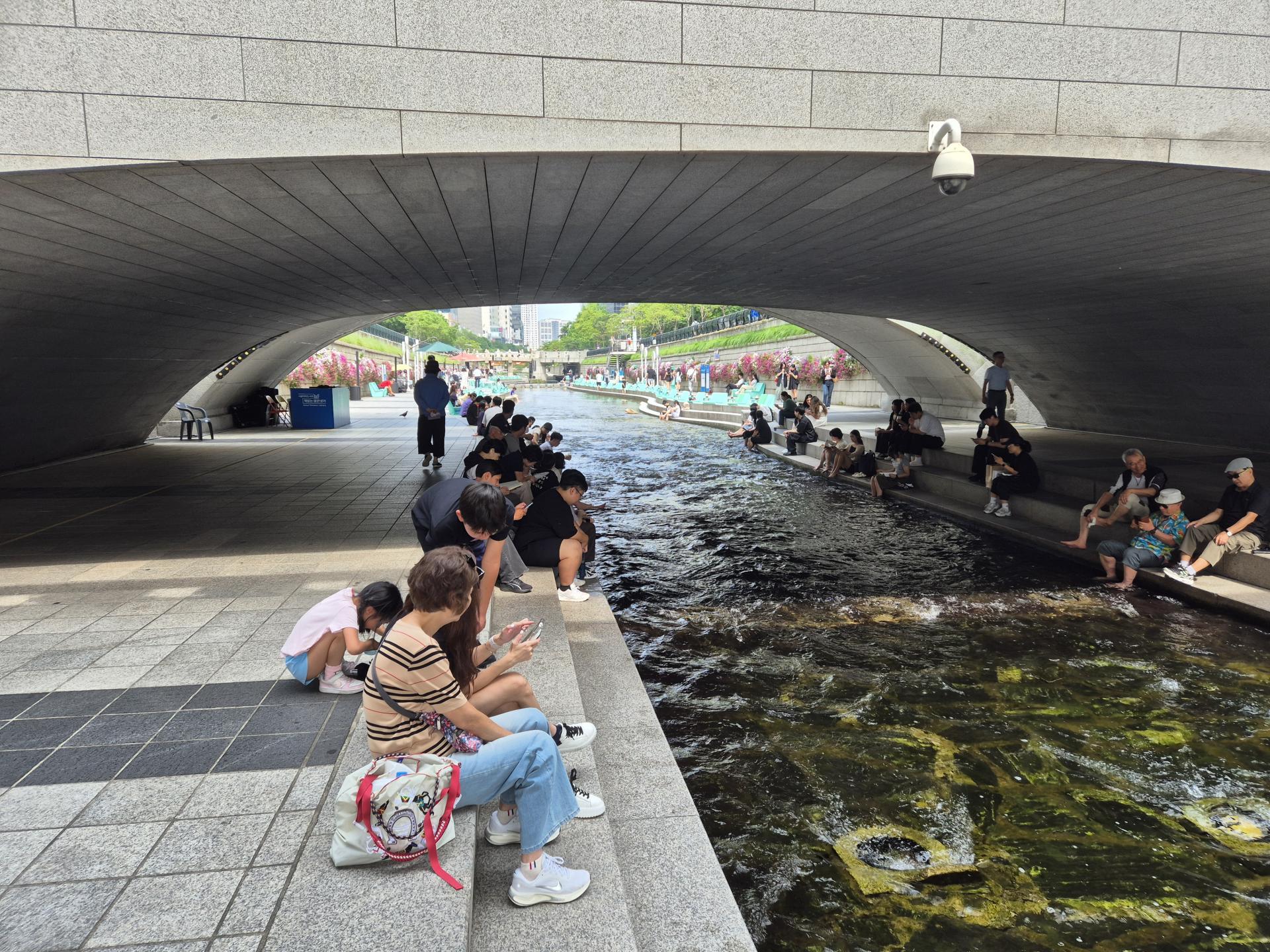 청계천 야외도서관을 방문하면서 가장 먼저 느낀 점은 접근성이 매우 좋다는 것이었습니다. 누구나 쉽게 다가갈 수 있는 위치에 있고, 산책 도중 자연스럽게 머무를 수 있어 편리하게 느껴졌습니다. 물이 흐르는 수질도 비교적 깨끗하게 유지되고 있어 사람들이 발을 담그고 쉬는 모습이 인상적이었습니다. 다만 아쉬웠던 점은 햇볕이 강한 시간대에는 교각 아래로 이동하지 않으면 그늘이 거의 없다는 점이었습니다. 비치된 우산을 활용하지 않으면 머무르기 어려운 상황이라, 자연스럽게 그늘에 앉아 쉴 수 있는 공간이 더 늘어나면 좋겠다고 느꼈습니다.