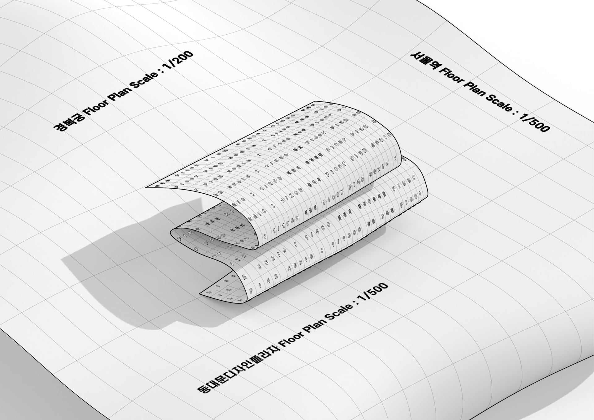 도면은 우리가 건축을 이해하는 방법 중 하나입니다. 그러나 아무리 정교한 도면이라 할지라도 건축의 모든 것을 담아내는 것은 어려운 일입니다. 건축은 모든 감각을 동원하여 느껴야 하는 대상이기 때문입니다. 따라서 See the room에서는 평소 경험했던 시각 중심의 건축이 가지는 한계를 보여주고, ‘입는 건축’에 대한 호기심을 불러일으킴으로써 촉각적인 건축 경험에 대한 고민을 촉발합니다. See the room은 세 단계의 시퀀스로 이루어진 ‘입는 건축’의 포문을 엽니다. 입는 건축을 본격적으로 경험하기 전, 먼저 옷걸이에 걸린 다양한 건축 도면들을 바라봅니다. 이곳에는 건축학과 학생들이 직접 설계한 여러 도면과, 서울 시민들에게 익숙하면서도 근대와 현대를 아우르는 경복궁과 서울역, DDP 도면이 담겨있습니다.